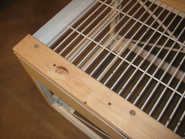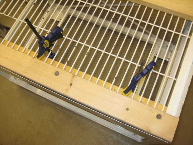 Luego perforé los orificios de 3/4 de pulgada a través de la 2 x 4 asegurándose de que los orificios en las aberturas en el trasiego de alambre pesado. Asegúrese de que el tornillo está flojo en los cuatro orificios antes de conectar la capa inferior de 2 x 4 bajo el tormento de alambre a las capas de dos. Conecté la capa superior dos de 2 x 4 con la capa inferior (debajo de la parrilla) con los tornillos de 3 pulgadas. Mantiene la estructura de madera firmemente en su lugar.