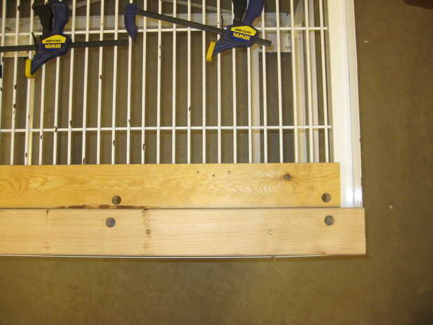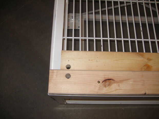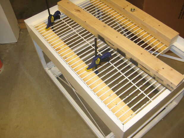 El carro con que empezó tenía un pedazo delgado de lámina de acero que forman un borde de 2 pulgadas en la parte superior de la tabla. Usé dos 2 x 4 apiladas sobre unos a otros que descansan en el estante de alambre pesado en la parte superior de la cesta. Puse otra capa de 2 x 4 en la parte inferior del alambre tormento.