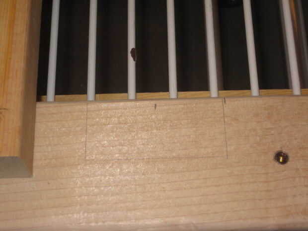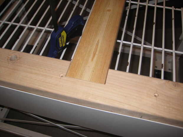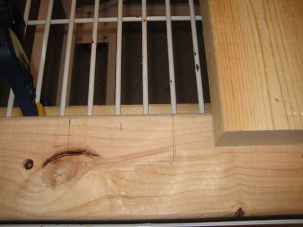 He añadido 2 X 3 madera travesaños para ayudar con la estabilidad lateral del marco. También ayuda a apoyar el material de superficie sólida. Lo hice cortar los travesaños a la longitud, tendido sobre las dos fuera de 2 X 4 que la longitud del carro y luego marcando el contorno de los travesaños con un lápiz. A continuación tomó las piezas marcadas y corte la muesca para los travesaños en la Sierra de cinta. Un tornillo a través del extremo de cada travesaño en el apilado 2 X 4 sostiene firmemente en lugar.