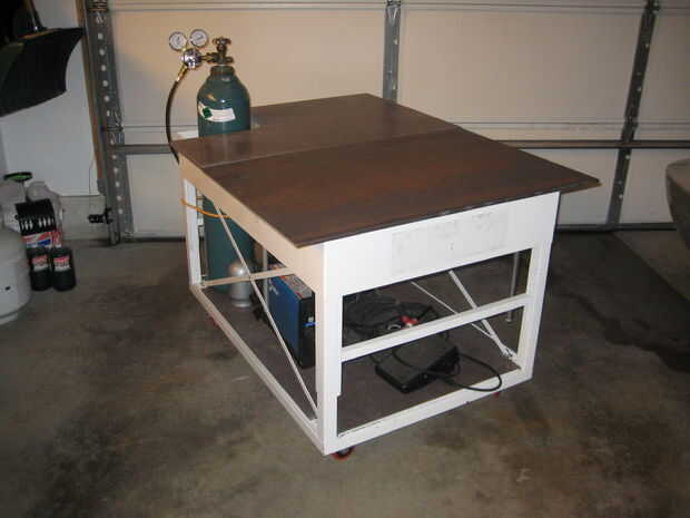 Cuando quiero mover la cesta fácilmente puedo poner el pedal de soldador, mangueras y pinza de masa en el estante inferior. El estante inferior tiene ya el soldador y el tapón de seguridad para el tanque de argón.