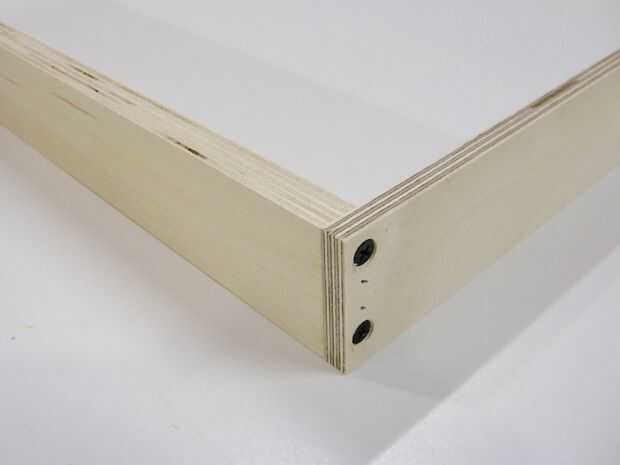 El marco fue pegado con tachuelas junto con clavitos y entonces sujetado firmemente con 1 1/4" tornillos en los agujeros avellanados. El panel inferior era simplemente pegado y atornillado en su lugar.