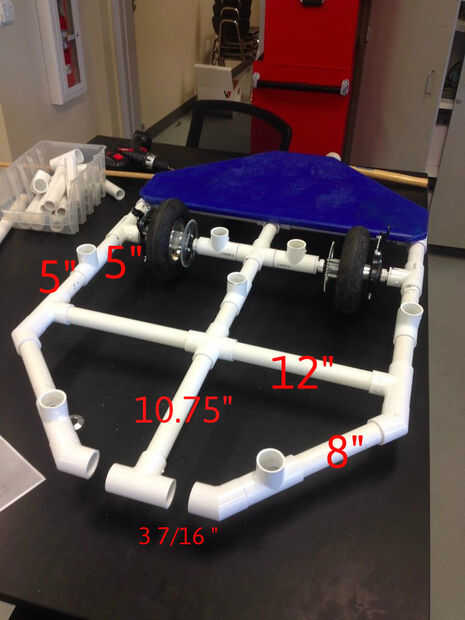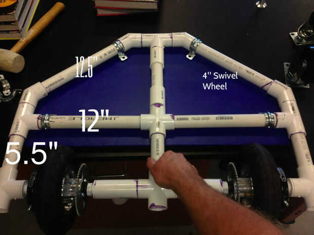 Varios diseños fueron dibujados y construidos para llegar a la versión final del proyecto y estoy seguro que podría mejorarse. Las primeras versiones fueron construidas con muchos conectores que el carro se convirtió en demasiado voluminosos y pesados (fotos de estos prototipos anteriores se incluyen al final del proyecto). La versión definitiva permite ser conducido en el aula y en nuestro ascensor sin dejar de ser capaces de llevar una carga razonable. Pesar de 1" PVC fue utilizado en todas partes para proporcionar fuerza y estabilidad 3/4" puede haber sido suficiente. La mayoría de cortes se realizaron utilizando una sierra de mano barata y disponible en el puerto de carga.