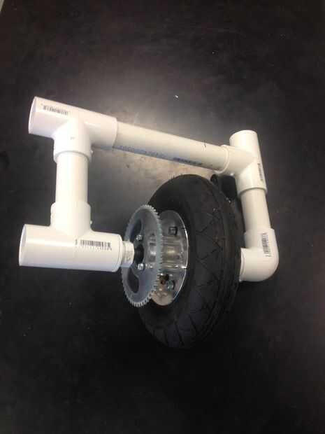El eje principal consiste en el eje metálico de la rueda se envía a través de un enchufe de 3/4" que fue perforado para permitir al eje metálico de la rueda para pasar a través. Un perno se sujeta a la clavija antes de que fue insertado en un reductor roscado 3/4" que se desliza de derecha a un conector T en un lado y un codo en la otra, como se muestra en la imagen de arriba. 1" cross conector conecta las Asambleas de dos ruedas haciendo un eje estable completado. Trozos de dos pulgadas de 1" PVC normalmente trabajan bien para unir conectores sin dejar un espacio. Este eje principal fue pegado con el típico primer púrpura y luego claro cemento de PVC.
