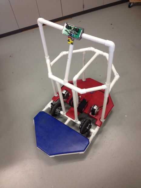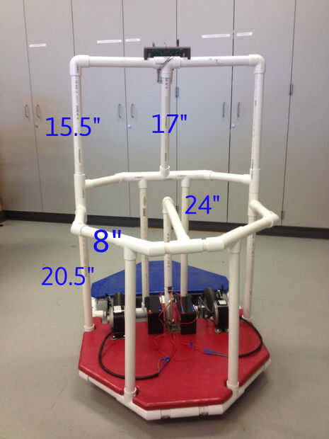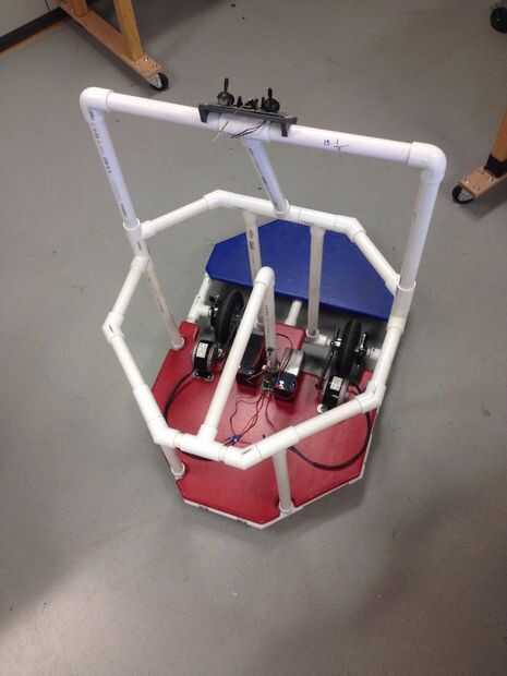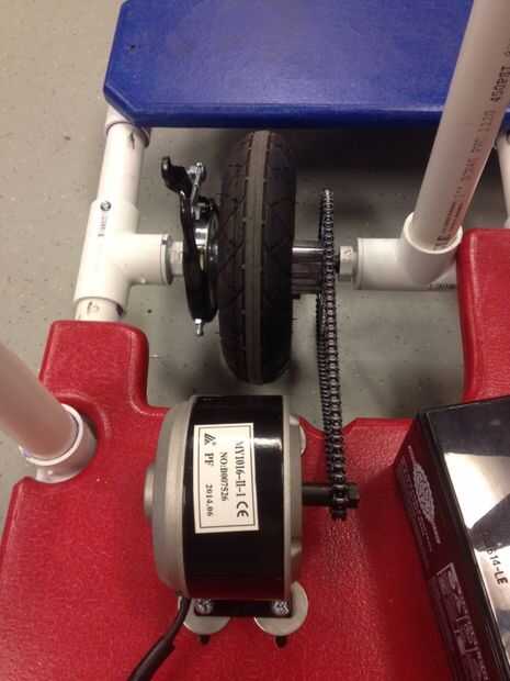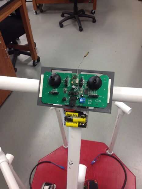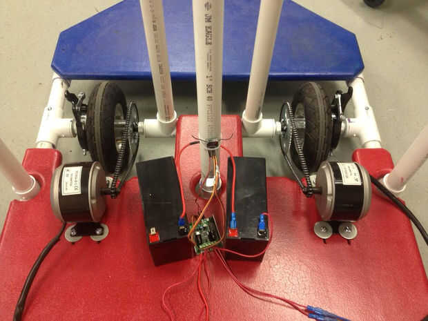 Dos baterías de 12 v se conectan en serie dando al sistema una alimentación de 24V y conectado directamente en el regulador del motor de Sabertooth (un interruptor se añadirán en la zona de conducción para facilitar un poco la tarea de alimentación). Cada motor también está conectado directamente en el regulador del motor de Sabertooth. Aunque nos habíamos pensado originalmente para el conductor del Motor 2x12A terminamos con la versión RC que no permite control por cable del potenciómetro. Por lo que nuestro sistema es totalmente inalámbrico y nos permite sacar el RC transmisor apagado el carro y manejarlo como James Bond. De las fotos el anclaje va desde una batería de 12V a la otra se muestra con el RC receptor conectado a la tubería vertical de PVC que recibe la señal desde arriba.