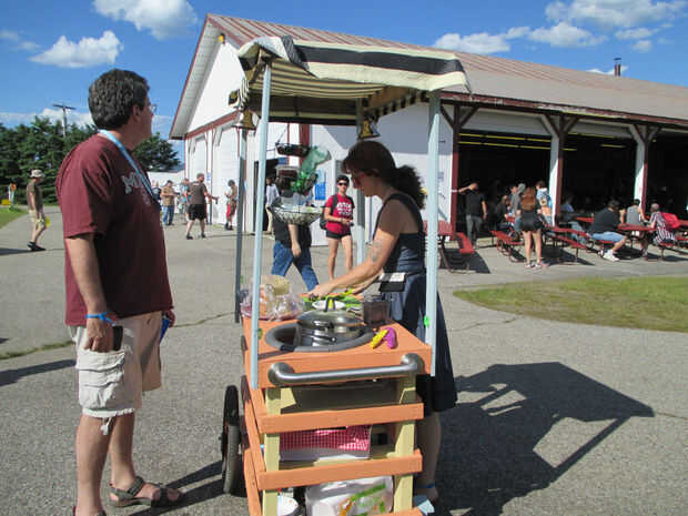 Cada mes de junio nos vamos a Porcfest. Tendemos a ser más emprendedoras que social y pasar una buena parte del tiempo de cocción y venta. El año pasado tuvimos un tipo de muchacha del cigarrillo/del caramelo de bandeja que cargaba, venta de galletas caseras y empanadas. Que salió bastante bien pero mi hija pensó que sería cool si tuviéramos una carretilla de mano real para rueda alrededor del camping, así que eso es lo que decidimos hacer.