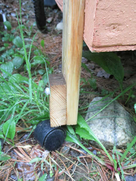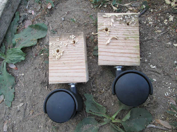 Había quitado las ruedas de mi aspiradora de taller y pensé que sería perfectos. Cortar pequeños bloques de madera, perforó un agujero en ellos para que coincida con el tamaño de la clavija, alimenta la unidad de la rueda y finalmente ésos en las patas atornilladas en el carro.