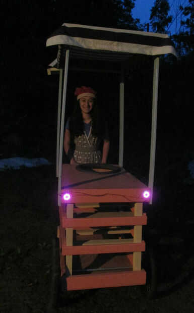 Se va añadiendo una campana para colgar de la parte superior del dosel, y puedo añadir algunos EL alambre en las llantas de bicicleta.