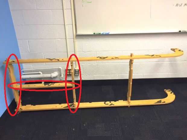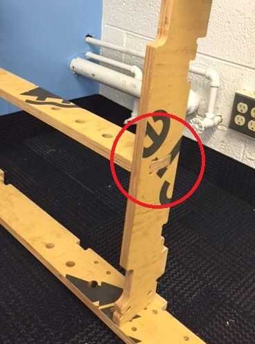 El primer paso del proceso es hacer la viga mostrada por los tres óvalos rojo en la foto de arriba. Estos tres pedazos de madera encajan entre sí como se muestra. Usted puede buscar los números correspondientes en los paneles entender mejor cómo cada panel debe orientarse.