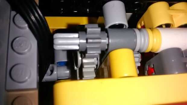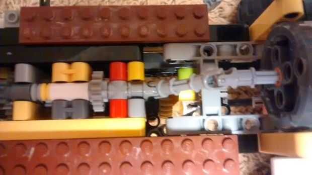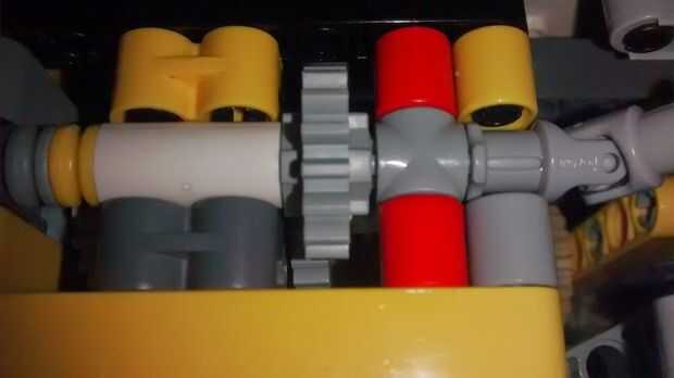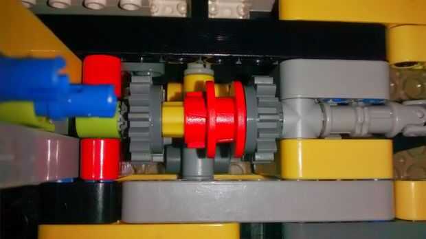 Este paso es el diseño y construcción de la transmisión manual de dos velocidades que conduce el carro. El corazón de la transmisión es dos engranajes separados. Un engranaje se engrana para ser exactamente la misma velocidad que la salida del motor. el otro engranaje se establece por un engranaje pequeño de un medio de conducción a la par y potencia tirando del carro. Para seleccionar entre los dos engranajes utilicé una pieza de Lego del cartón de leche para mover una pieza de selector hacia adelante y hacia atrás. La unidad de cada engranaje de los ganchos agarradores el selector que activa el eje de salida.