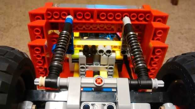 El marco principal sobre todo es apoyado directamente por la transmisión en el medio del camión. El diseño está centralizado alrededor de la transmisión para que haya un marco fuerte para el resto de los accesorios. La suspensión iba originalmente a ser parte delantera y trasera, pero debido a complicaciones con el engranaje en la parte trasera del camión, decidí ir con solo suspensión delantera. La suspensión delantera está conectada directamente al chasis del carro y luego hacia el estante y el piñón. La adición de juntas de la dirección mecánica permite el frente pivotar hacia arriba y hacia abajo cuando sea necesario.
