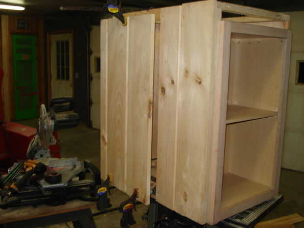 Step(1) la puerta fue hecha por tablas shiplap 31'' larga y realizó 16'' de ancho. atornilladas en el interior con pedazos de desecho de 2 pulgadas de madera pegados y luego atornillados en la parte posterior de la puerta.