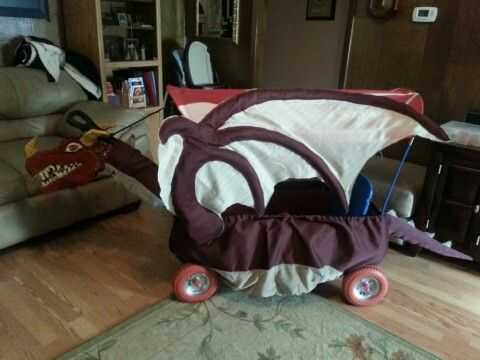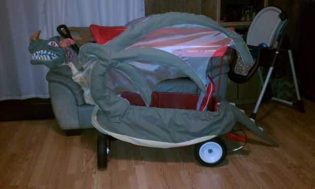 nos gusta ir a la renacentista local Feria y algunos de nuestro grupo de vestir cuando vamos. Este iba a ser el primer viaje con nuestro hijo de un año de edad, por lo que hemos querido hacer especial. Yo había visto varias versiones de vagones y carruajes para niños hacia fuera en la feria o en internet, pero quería hacer nuestra propia versión de un carro del dragón. Mi mamá y mi papá ayudaban con este proyecto así que tengo que darles apoyos en el producto final. También ayudaron a mantener mi kiddo entretenidos mientras que hice mucho el corte, fijando y costura de la tela. Nos llevó un total de 3 meses trabajando y para hacer 2 de estos. El primero fue mucho de ensayo y error, pero una vez que tuvimos un patrón y una idea de lo que estábamos haciendo, el otro se unieron rápidamente. No he visto uno como lo que hemos creado en cualquier lugar y que les espero guste.