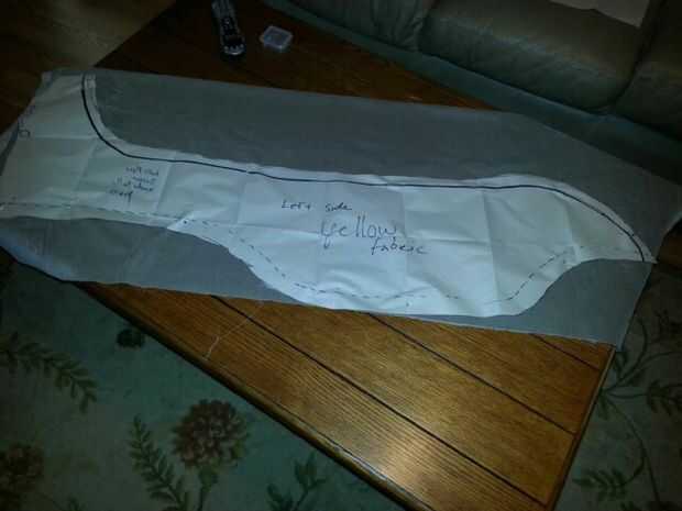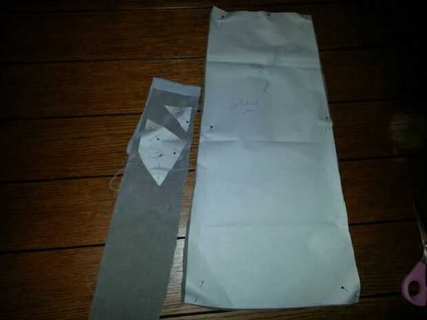 Una vez que tenía las piezas averiguadas y diseñó el patrón que era tiempo de poner hacia fuera en la tela. En el color principal del cuerpo (en rojo en las fotos), hay 3 piezas de la cola, el cuerpo principal (que puede ser una o dos piezas dependiendo de si usted puede situarlo en un pliegue o no), 2 piezas de ala y 2 piezas para el cuello. En la tela para las porciones de tela o vientre de contraste (estos fabricin gris se muestran las imágenes) hay 2 piezas de ala, parte de un cuello, el vientre (otra vez 1 o 2 piezas dependiendo de si está en un pliegue), 4 puntos en la cola y 5 puntos para el cuello. La tela de corte sólo es 2 piezas de la membrana del ala. Ya que estábamos perplejo en el diseño del ala, eran lo último, diseñados y fabricados para ambos carros. Porque cambiaría el dedo como piezas en las alas sobre nosotros, dejamos la pieza de la membrana del ala para mantenerla en línea mientras que cubrió el patrón del ala a la tela.