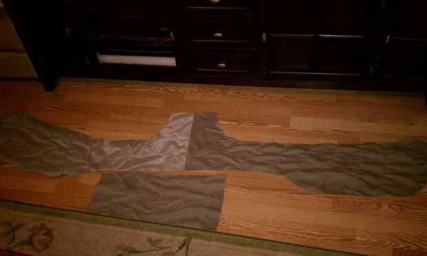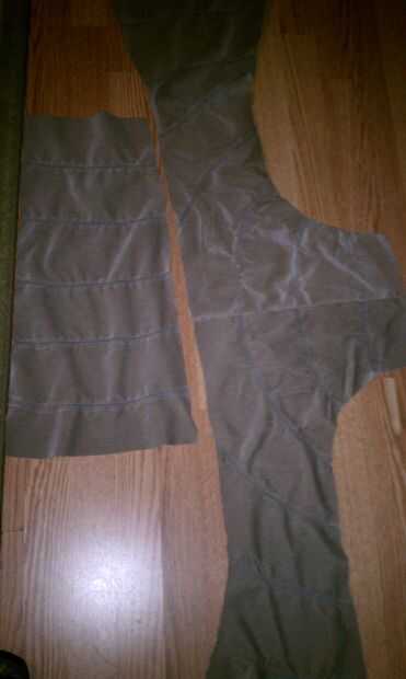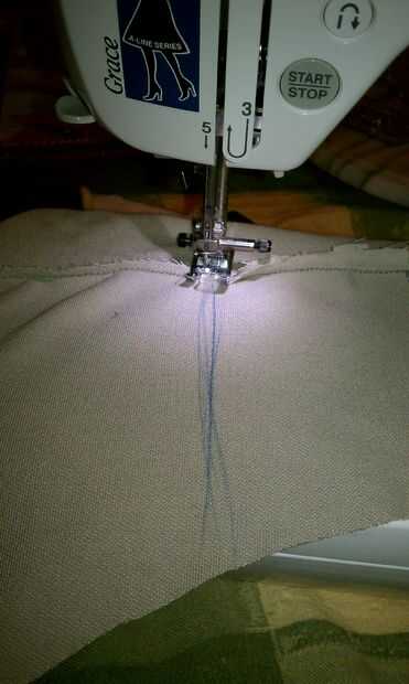 Luego cosí a la tela del cuerpo superior a las piezas de tela del bajo vientre después de fijación th uno frente al otro con la misma fina zig zag puntada derecho contra derecho. Ahora que fueron cosidos juntos, se parecían a un tubo muy ancho. Manteniéndolo dentro hacia fuera, vuelto por una costura de 3/4 de pulgada para permitir elástico para ejecutarse a través de los bordes superior e inferior dejando un agujero de 1 pulgada para funcionar a través de 1/2 pulgadas de elástico a través de ambos. Ayuda a mantener el cuerpo apretado para el carro, pero lo que le permite deslizar y apagar fácilmente. Antes de cortar el elástico, encajamos el cuerpo en el carro para determinar la cantidad correcta de damos en el elástico. Porque estábamos usando a una tela pesada, tuvimos que utilizar menos elástico para mantener apretado. Coser juntos los pedazos de elástico y corte extra.