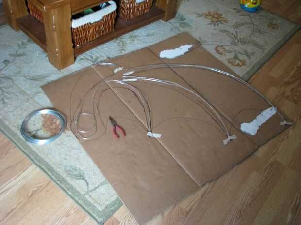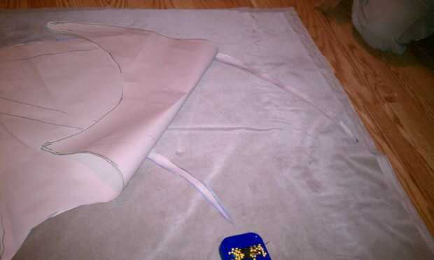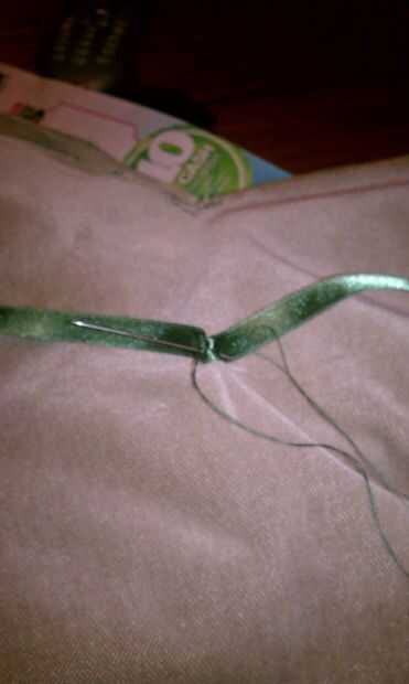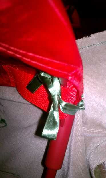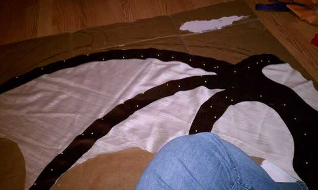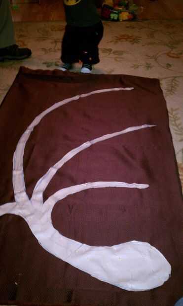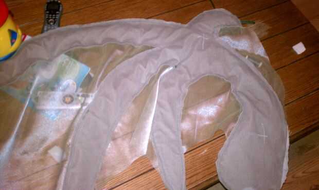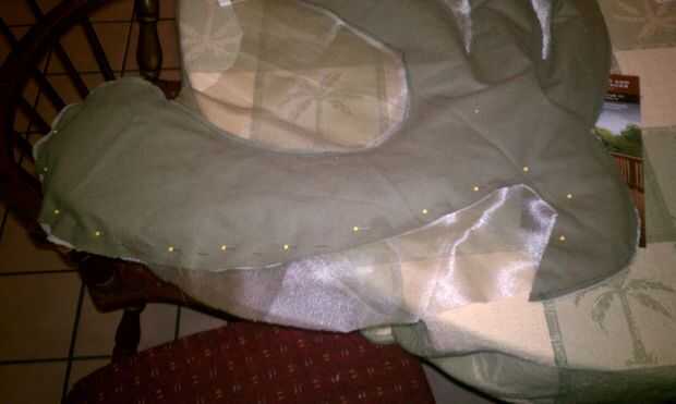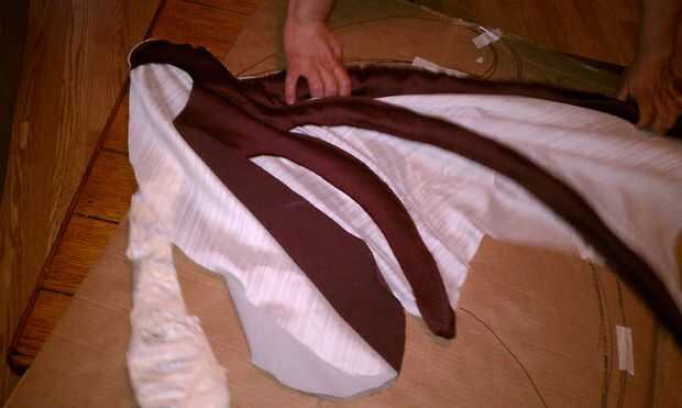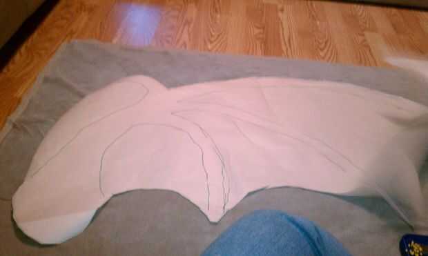 Ahora que el ala está cerrado, llevó a cabo hasta el pabellón para determinar que estamos los lazos para mantener sería en. Marcamos 3 puntos con un lápiz en el lado de tela contrastante y había cosido a mano 3 lazos en el ala. Utilizamos pedazos de desecho de la misma tela cerca de 12 pulgadas de largo por 1/4 pulgada de ancho para permitir un arco. También puede utilizar la cinta si quieres y tienes. Hemos optado por no garantizar el ala al cuerpo ya que facilitan su montaje. El también le permite lavar el cuello y el cuerpo si se ensucia. Las alas pueden ser manchas tratada para que no doble fuera de forma o desordenar el interior relleno de periódico.