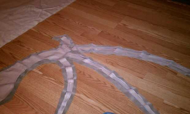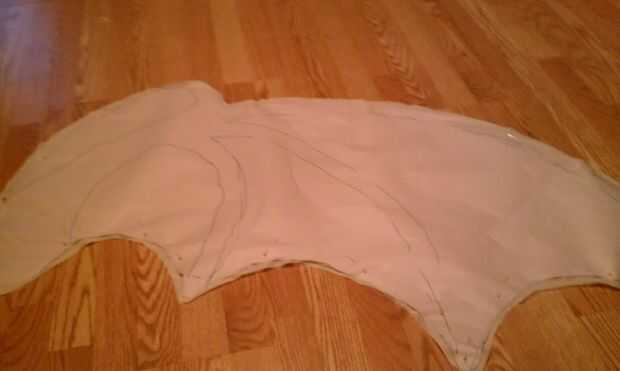 Después de poner el patrón de las alas que ayudó a poner el patrón de la membrana del ala sobre ella mientras la fijación para asegurarse de que los dedos se alinean con el ala. Corte 2 patrones de dedo ala de ambas telas de color. A continuación prender y cortar 2 de los patrones de la membrana del ala de la tela escarpada. Una vez hecho esto, tomar un patrón contrastante del dedo (gris), un patrón de dedos de color principal (rojo) y una membrana del ala. Luego con los lados mal juntos, usted será emparedado a Tejido voile th entre. Prender las piezas juntas y coser todo menos la curva exterior de la base del ala. No preocuparse de torneado bajo el borde para darle un aspecto más limpio, pero aún se veía bien. Ahora deslice la tela en el marco de alambre y el alambre de abajo en cada uno de los dedos. Ahora, la abertura del perno y coserlo cierre. Fui capaz de hacerlo en la máquina dependiendo de cómo densamente el marco es y cuánta tela le le puede tener a mano puntada cerró. No puede Agregar el gel fray a los bordes de la tela en los dedos y la membrana del ala para evitar que se deshilache demasiado mal.