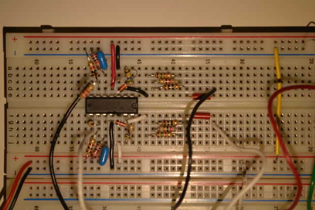 En la foto, se puede ver cómo me enganchado a la placa. Los cables rojos y negros en la parte inferior izquierda de la foto a la pinza de la batería de 9V. La línea amarilla en la mano derecha de la imagen ganchos de los rieles interiores dos juntos como una tierra. Lo positivo de la 9.6V rebozar ganchos directamente en carril positivo superior. La negativa (realmente una tierra) va a nuestro interior baje el carril (el carril positivo más cercano a la columna j)