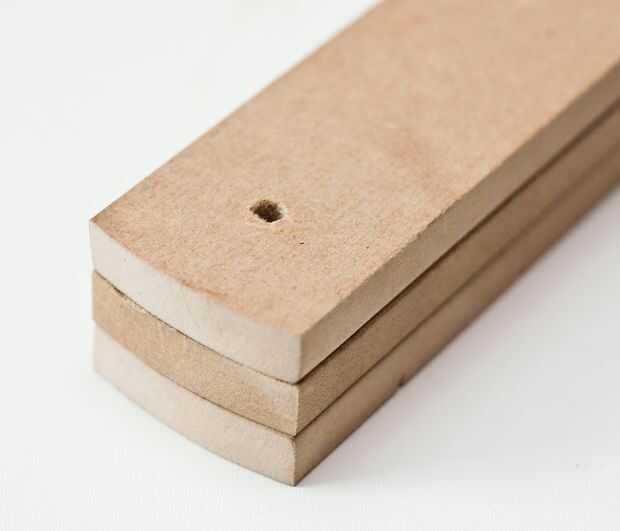 Cuando ha cortado los tres brazos de madera taladre un agujero en un extremo de cada tabla y alise los bordes con papel de lija.