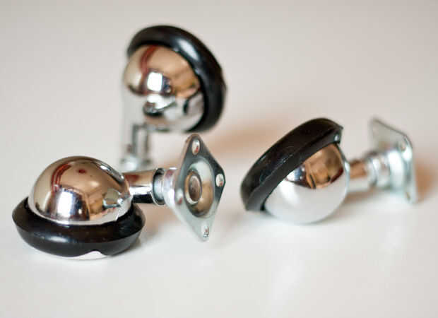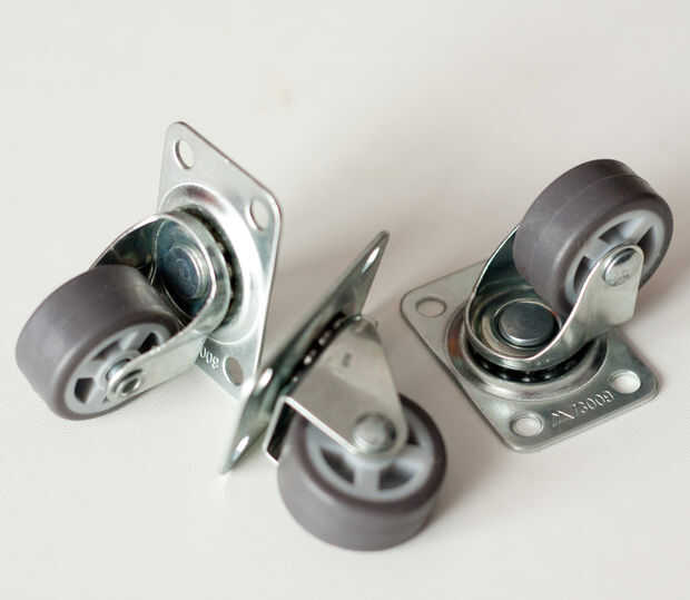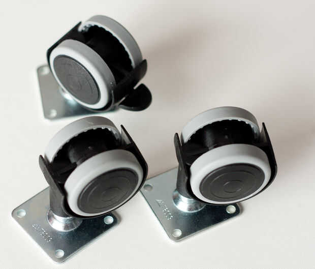 Tuve algunas ruedas de muebles, pero tenían una gran placa base y no encajaba en mis cojines de los 3x4cm. Por lo que he encontrado diversas ruedas, autobuses algunos necesitan una cavidad en la madera, y tengo un fino brazo mdf donde ya existe una cavidad (en el lado opuesto) para las patas del trípode. Por fin hay algunas ruedas esféricas agradables con un tornillo largo, pero en este caso también tiene no suficiente profundidad para atornillarlos.