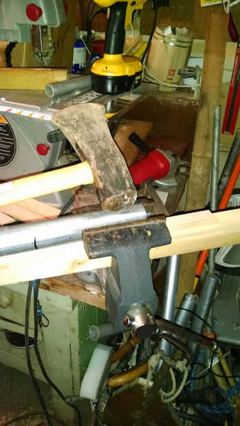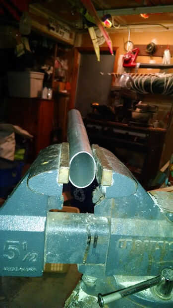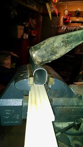 Ahora lo que tienes probablemente han notado es que la pipa de 1.5" no se ajusta en el orificio de la estaca. Ahora viene el truco para arreglar eso. Mira las fotos. Primero pones el extremo del tubo que encaja en la bodega de la estaca en la mordaza y apriete en un óvalo. Una vez el diámetro del óvalo corto es suficientemente pequeño para caber en el lado corto de la bodega de la estaca, luego use un mazo para las vueltas cortas de oval plano del martillo. Mantenga el tubo en la mordaza para no abre el diámetro corto, poner un trozo de madera debajo de la pipa así como usted martilla el tubo no empuje hacia fuera de la mordaza, y martillando obtendrá una forma rectangular muy buena fuera de la final de la tubería.