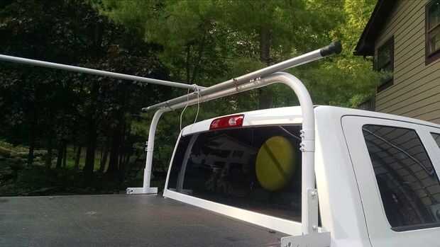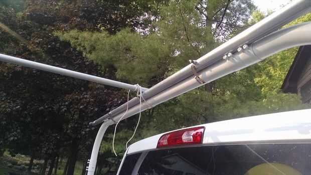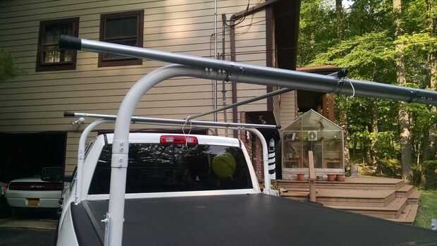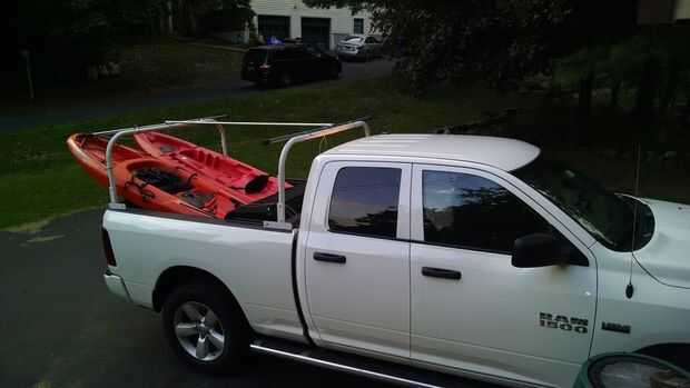 mi kayaks eran tan amplias, que necesitaba extra ancho, así que tomé mi viejo kayak rack barras y les fija a la barra horizontal con un par de abrazaderas de manguera. Realmente tengo 4 kayaks, e irónicamente, los ones breves ni siquiera necesita la parrilla de kayak (DOH!!!