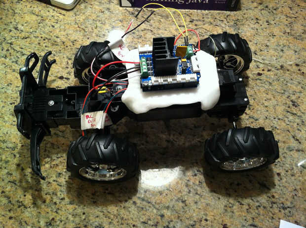 - Coloque el soporte en el armazón, el Arduino con el escudo del Motor conectado en el Monte, y el cuerpo del carro de nuevo el marco (sin tornillos necesarios; no será allí por mucho tiempo!).