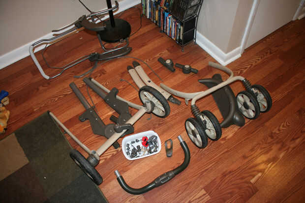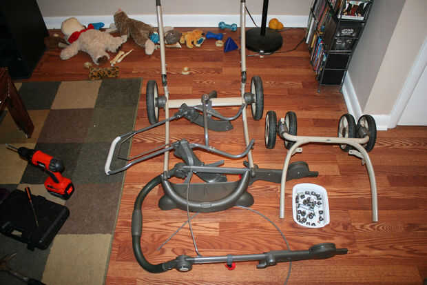 Lo primero que hice fue quitar el asiento y la cubierta y arrojó a la basura! Entonces individual de secciones del cuerpo de la silla de paseo. Esto presentó un problema porque no estaba montada con tuercas, tornillos y pernos estándar. Se llevó a cabo junto con remaches. No contar con una herramienta de remache, llevó un taladro con una broca de metal a cada remache hasta que era capaz de eliminarlos. Estos se sustituirán con pernos más adelante.