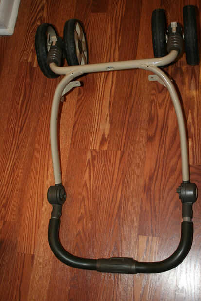 Yo jugaba con un par de configuraciones. Originalmente estaba pensando de la utilización de las ruedas traseras porque son más grandes, pero salió que la agarradera encaja perfectamente en las ruedas delanteras. Bonus: los mangos son capaces de doblar!