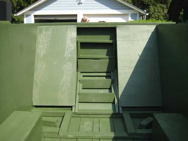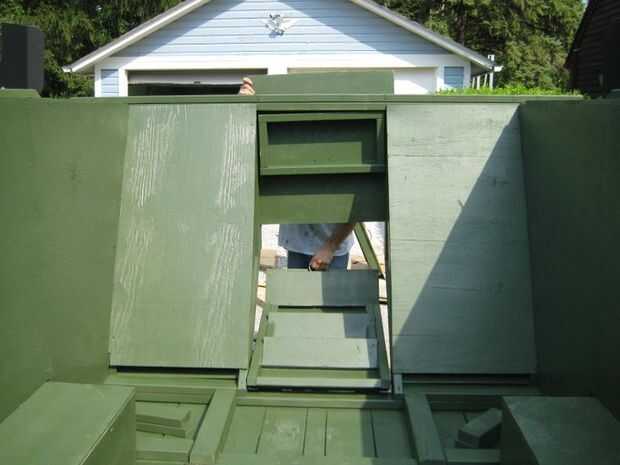 La sección superior se deslizó dentro de una pista construida de madera contrachapada. Resbaló en la pista a su placa de parada, permitiendo que la sección inferior de la bisagra hacia abajo, y luego la parte superior deslizó hacia abajo y hacia fuera de la pista. Era desprendible de la carroza para acceder.