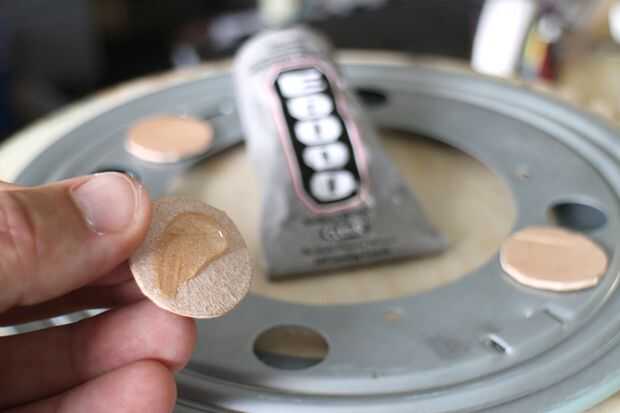 Que cortar las tiras de cuero en círculos y cuatro a la serie teniendo usando E6000, mi favorito adhesivo adjunto.