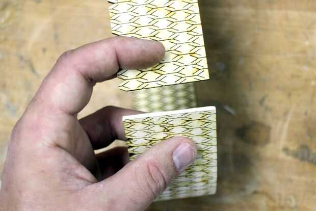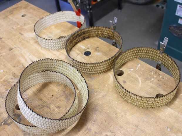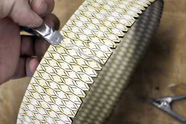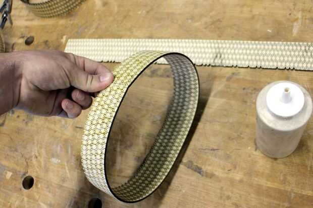 La madera contrachapada del corte doblado ya se corta a la longitud correcta y ahora se puede doblar para tener los extremos tocando, formando un anillo. Aplique una pequeña cantidad de pegamento de madera hasta el final de la pieza de corte doblado y conecte el otro extremo, luego sujete en su lugar.