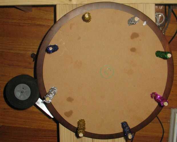 Tenga en cuenta que originalmente habíamos probado un metal bandeja giratoria del cojinete, pero en la prueba, parecía encerrar. Tal vez conseguimos algunos trastos en los rodamientos de bolas. Utilizamos aceite etc. en vano. Así, fuimos a la tienda y encuentra un susan perezosa de madera en el Departamento de cocina. Sustituimos el metal del cojinete con eso, y funciona muy bien. Nosotros debemos acaban de empezar con eso primero en vez del círculo de madera de MDF, pero desde que tuvimos el otro círculo ya corte y tacos encolados en, acaba de poner el derecho de un existente en la parte superior.