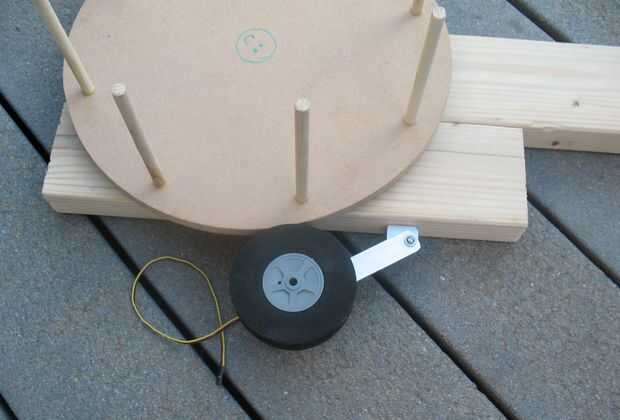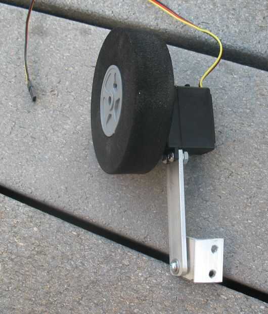 A continuación, adjunto una rueda Lite Flite el Horn del servo y hecho un soporte para dejarlo hacer pivotar hacia adelante y hacia atrás. Para colocar la rueda, hemos perforado el agujero en el centro de la rueda (hub) un poco más grande para permitir que el tornillo de horn de servo. Luego lijar la arista del cubo y utiliza un par de chapa #4 tornillos en los agujeros pretaladrados para contener el cuerno a la rueda.