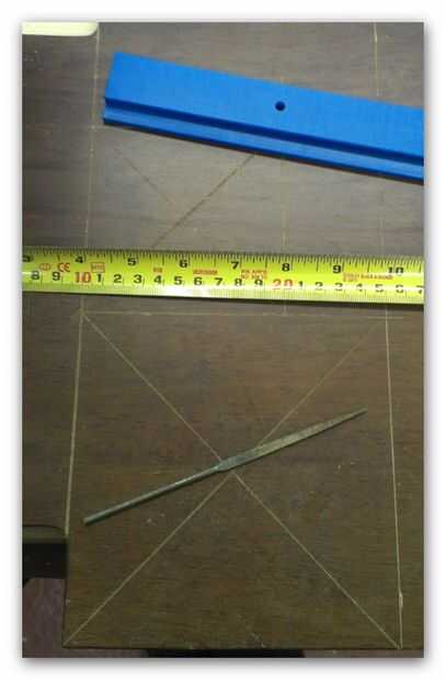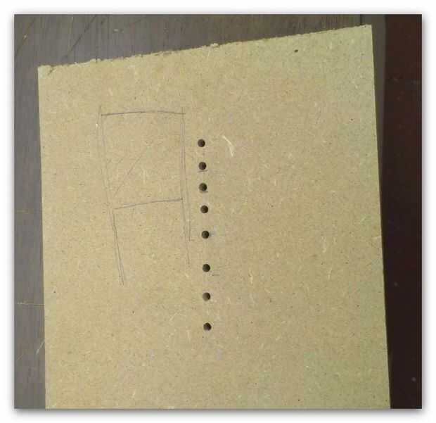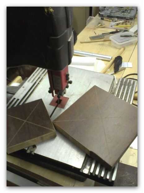 La base y la plataforma colgante cuando desde lo alto de una vieja mesa, rayado 2 plazas (15 cm y 10 cm) y luego marcó el centro de cada uno con una cruz y cortar ambos usando una sierra de banda.