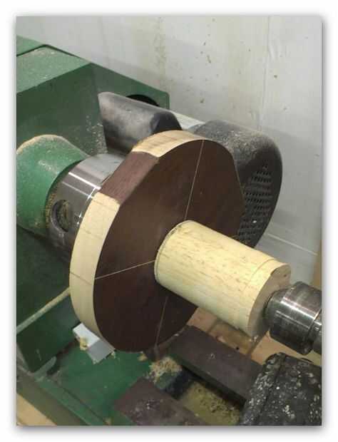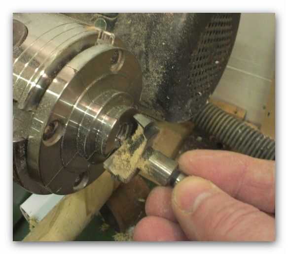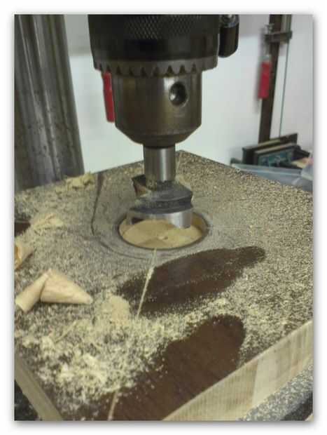 La plataforma tendría que colgar gratis desde el poste central, usé una corta pieza Forstner para perforar parcialmente en el centro de la Plaza de 15 cm. Durante el rodaje la plataforma conectarse los torneros en expansión por lo que me aseguré de que la broca era más grande que las quijadas que estaría utilizando. Esto también garantizaría que colgaría la plataforma libre del poste de centro una vez mas.