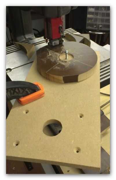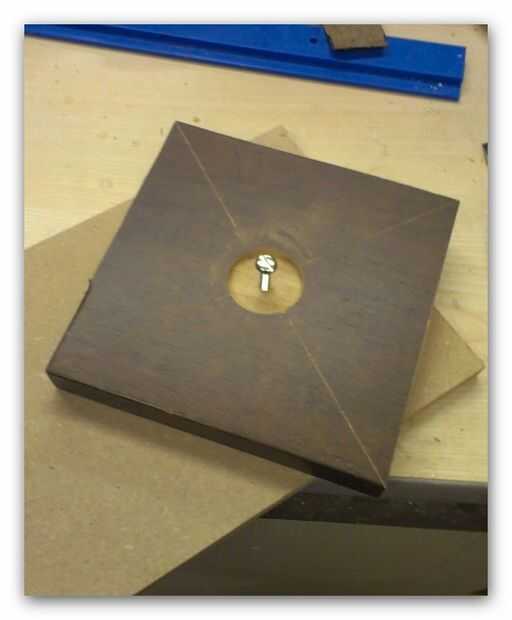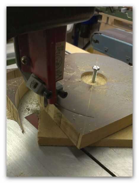 Luego perforar un agujero de 6mm en el centro y la plaza al MDF en imagen 6 de arriba, esto entonces fue fijado a la sierra y la mayor parte del material de desecho eliminado girando el cuadrado con la sierra corriendo (si lo haces de esta manera tomarlo lento como su fácil correr y romper la hoja.)