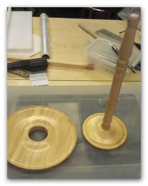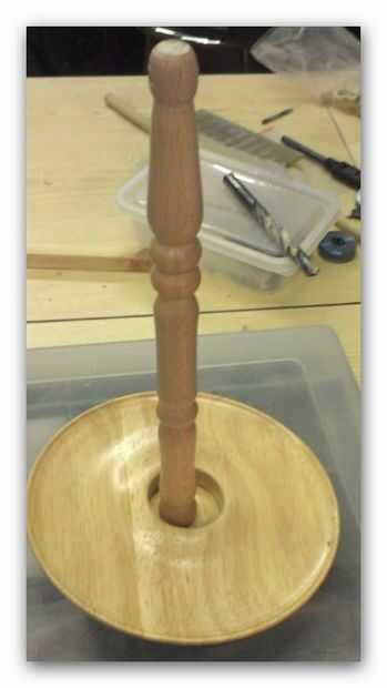 Luego perforé nuevamente el agujero en la base de 10 mm y una vez que el eje había sido dado vuelta y terminado fue unido a la base utilizando la espiga y pegamento.