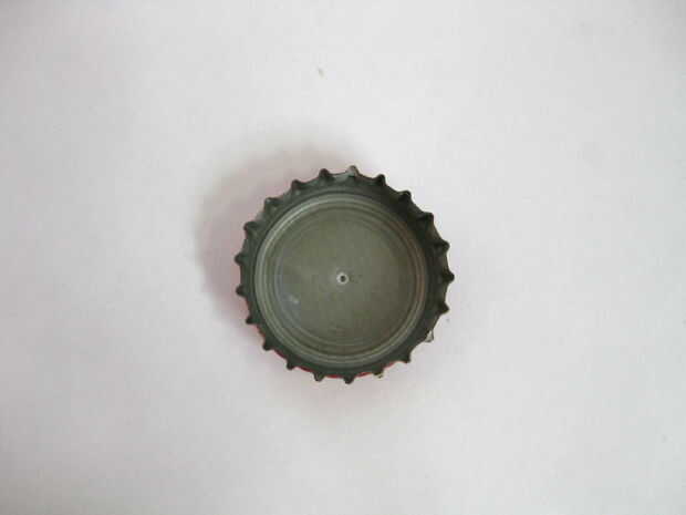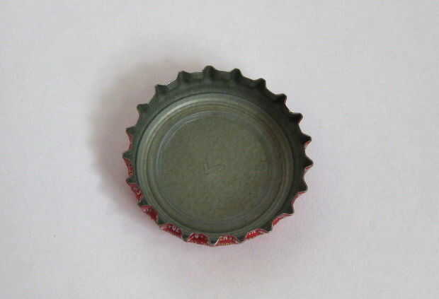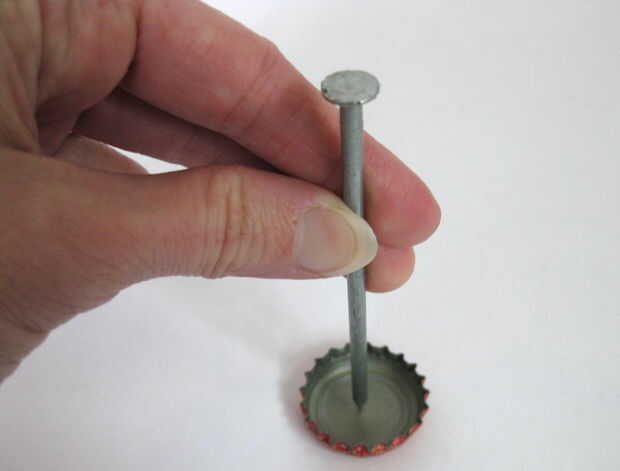 Tomar la tapa de la botella de metal y dale la vuelta. En el centro, suavemente utiliza un clavo y un martillo para hacer un pequeño hueco. Debe hacerlo cuidadosamente sobre una superficie blanda, como alfombras. La abolladura debe ser lo suficientemente grande como para que la punta de la brocheta se lleva a cabo en él. Sin embargo, si usted hace la abolladura ir todo el camino a través de la tapa, luego la brocheta puede atascarse en él. Accidentalmente hice la abolladura un poco demasiado profundo, pero luego usa el martillo en la parte superior de la tapa de la botella suavemente martillo la parte plana, y esto funcionó bien.