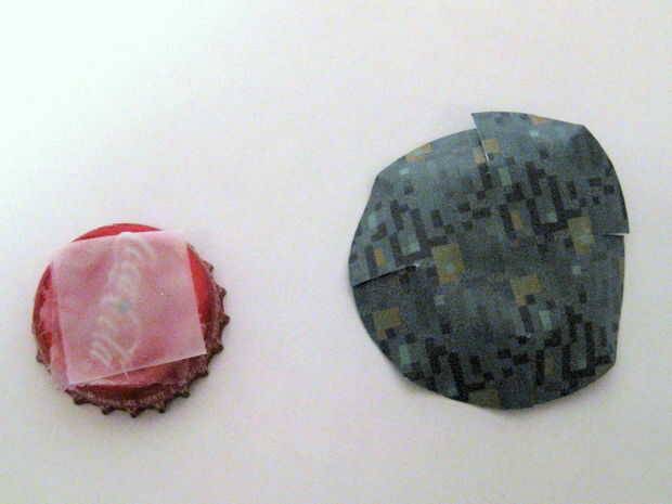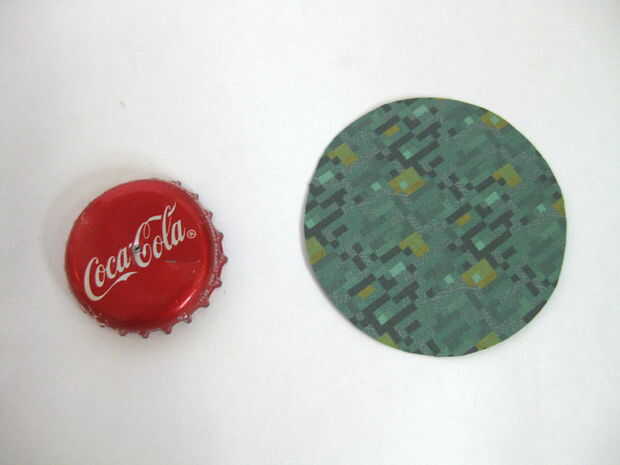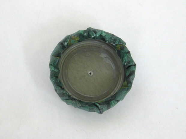 Una vez que tienes una buena cápsula abolladas, tome el trozo circular de cartulina (que corte en el paso 2) y hacer pequeños cortes de interior en cuatro puntos equidistantes a lo largo del borde del círculo. Poner doble cara cinta adhesiva en la parte superior de la tapa y colocar el papel circular en la parte superior, lo centrado en la tapa de la cinta. El papel alrededor de la tapa del molde para que quede suavemente la tapa. Luego envuelva los bordes del papel alrededor de la parte inferior de la tapa de la botella, a lo largo del borde. Use porciones de pegamento en el papel que va en la parte inferior de la llanta para pegar el papel (como papel maché) y a la tapa de la botella. Mantenga en lugar durante unos segundos y luego permite completamente varios minutos para que seque.