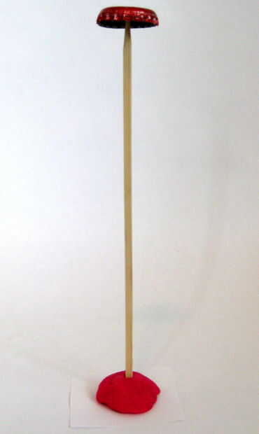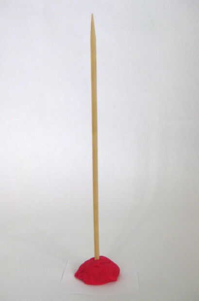 Para asegurarse de que la tapa de la botella se balancea bien, ahora vas a empezar a construir el árbol. Para ello, tomar el pincho y pegarlo en una pequeña pelota de play doh para que el filo está apuntando hacia arriba. Si usted necesita ajustar la altura de la brocheta para ser unos 20 cm de altura, hacer ahora (antes de ponerlo en el play doh) cortando el extremo plano.