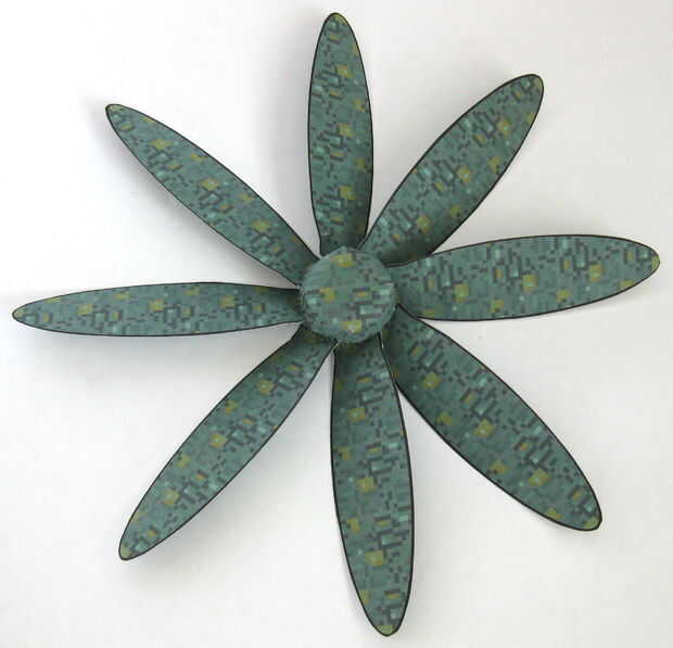 Una vez seca la parte superior de la tapa de botella, pegar a la parte superior del círculo en el centro de las hojas. (Asegúrese de que los puntos laterales de las hojas queden hacia arriba.) Pegar la tapa superior como centro para el círculo, debe ser un ajuste casi perfecto. Dejarlo completamente seco antes del siguiente paso.