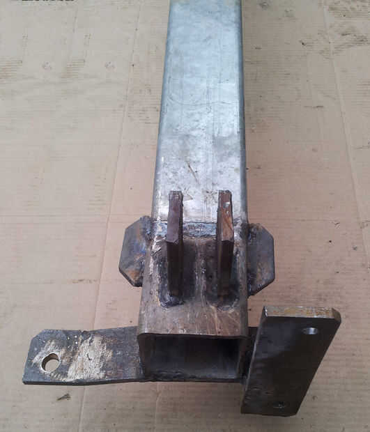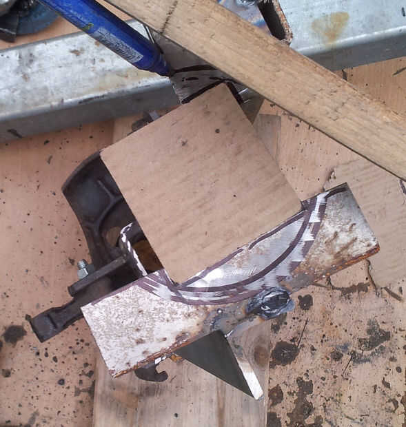 Cuando el marco de la toma del tubo, la llanura de la rueda giratoria debe ser 90° en el tubo, y también debe estar en el centro. Por lo tanto considerar una construcción auxiliar. Es decir, añadir dos barras de 50cm alrededor de la futura posición del tubo. Coloque el cubo de la rueda con el marco de la toma de corriente en una mesa con una barra fija superior. Soldar un trozo de metal en la parte superior, por lo que se puede dibujar un círculo cuando el eje de giro. Corte la circunferencia del tubo futuro en medio de este círculo, como en la foto. Deslice sobre el tubo y soldar juntos. Añadir 2 soportes extras para estar seguro.