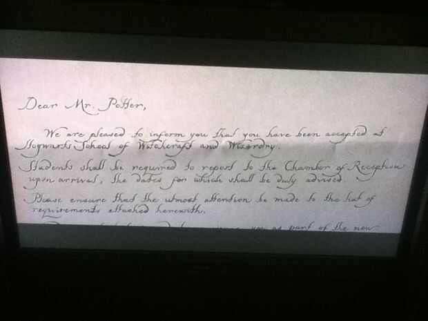 Primero debe decidir lo que quieres hacer; una carta personalizada o más de una proposición de la película. Siguiente decisión es a mano escribir la carta o tipo e imprimirlo. Estoy escribiéndolo ya que no soy bueno en caligrafía. Ahora que sabes lo que haces hasta puede empezar en él. En la carta dice: "Colegio Hogwarts de magia y Hechicería Director: Albus Dumbledore (orden de Merlín, primera clase, gran Sorc, Chf. Warlock, Jefe Supremo, Confed. Internacional de magos) Estimado Sr. Potter, nos complace informarle de que has sido aceptado en la escuela Hogwarts de magia y Hechicería. Por favor adjunta una lista de todos los libros necesarios y equipo. Plazo comienza el 1 de septiembre. Esperamos su lechuza no más tarde de 31 de julio. Tuyo sinceramente, Minerva McGonagall adjunta Directora de curso, esto habría sido lo que sería en él si Dumbledore no han muerto pero que puede ser fijo. Tampoco puede mantenerla de esa manera o revisar que coincida con lo que podría ser lo que es enviado ahora. De cualquier manera hacerlo he puesto una imagen de la película que se puede utilizar para hacer referencia a lo que debería parecerse.
