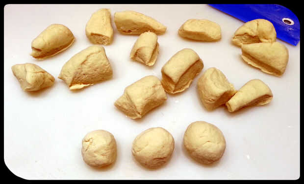 Este paso podría ser más simple. Sólo el rodillo la masa en un tronco, cortado en pedazos de 12-16. Doce piezas te dará 8"- 9" carta, dieciséis le dará carta 6"- 7". Una vez cortadas, enrolle cada pedazo en una bola.