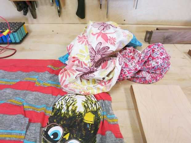 Comenzamos con las tapas de las mujeres de buena voluntad (tienda) que tenía motivos florales. Pagamos $9 dólares para 4 camisetas. Luego cortamos caoba retazos en rectángulos de 6 "x 8". Dependiendo del grosor de la tela, cortar entre 3-10 capas de cada patrón. Máximo lo que podría salir de cada camiseta y terminó con 4 capas.