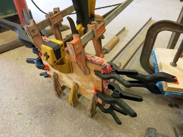 Utilicé el sistema poniente dos parte de epoxy. Ser muy cuidadoso con estas cosas. Como se puede ver en el video, consiguió bastante caliente humo y mucho más rápido de lo esperado. Hacer un "sándwich de tela" con una capa de la madera, la tela y luego una pieza sacrificial de la madera. Hacen de la madera sacrificio tan fina como sea posible. Sujete todo juntos, incluso como sea posible.
