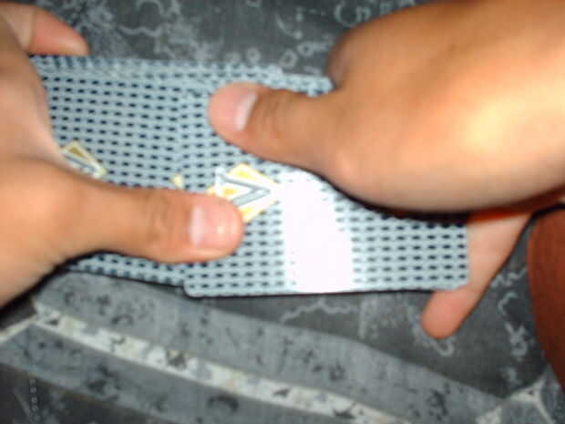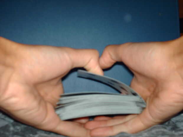 Bien, por lo que hay no más divertido y fácil cosas ya y no más de mis inútiles intentos de hacer bromas trashy. Esto es muy importante, poner los pulgares en el centro de las cubiertas que se cruzan de lado a lado. Si no haces esto, crecen nuevos pulgares. Empuje la cubierta entera hacia arriba en forma de media luna, manteniendo los pulgares posición--y dejar las cartas caer en los dedos.