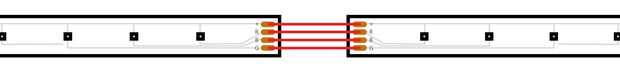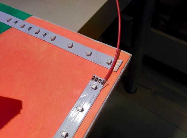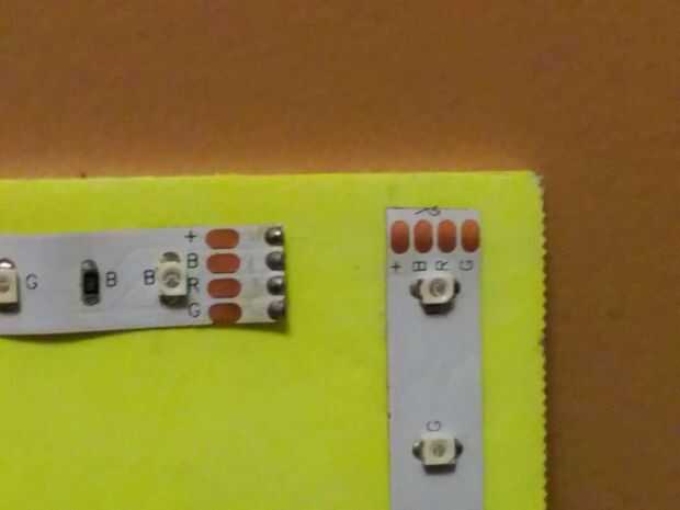 Ahora que estaba seguro de que este cartel era "el", decidí aplicar las tiras de LED en el exterior por cortar a longitud y luego pegándolas en con el forro adhesivo. Desde que cortó las conexiones cuando corté la tira del LED, necesitaba soldarlos nuevamente juntos (ver foto). Mi tira LED tenía 3 conexiones: +, azul-, rojo - verde -. Tuve que soldar las conexiones de una tira a la siguiente hasta que hubiera interconectadas todas las tiras de LED. Uno de los contactos adecuados de la parte inferior había izquierda sólo y había hecho un conector más largo en su lugar. Este conector se encenderá el LED.