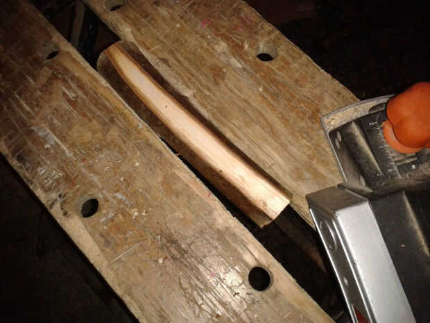 Obtener su 'registro' y corte hasta su longitud solicitada. Debe ser unos centímetros más de largo que cualquier diseño que desea agregar como una especie de red de seguridad. Una vez que esta longitud de la madera o bien vio en mitad o plano a una superficie plana y lisa. Opté por utilizar un avión de madera pero papel de lija funciona igual de bien, sólo tarda más tiempo.