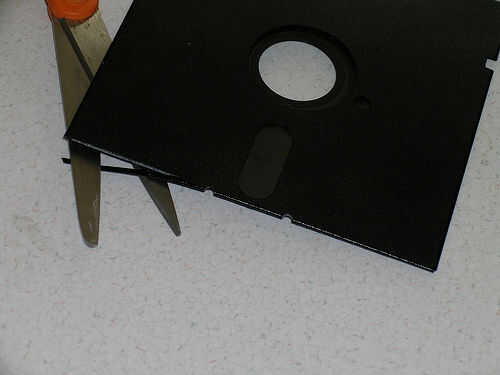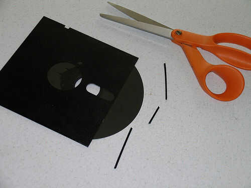 Utilizar las tijeras o el cortador de papel para recortar un borde del disquete. Corte el borde con las dos pestañas pequeñas ya cortadas para hacer un borde incluso. Usted puede sacar el disco y tampoco descartarlo o con un cierto uso maravilloso (yo he estado ahorrando mina hasta que puedo venir para arriba con un uso adecuado para ellos).